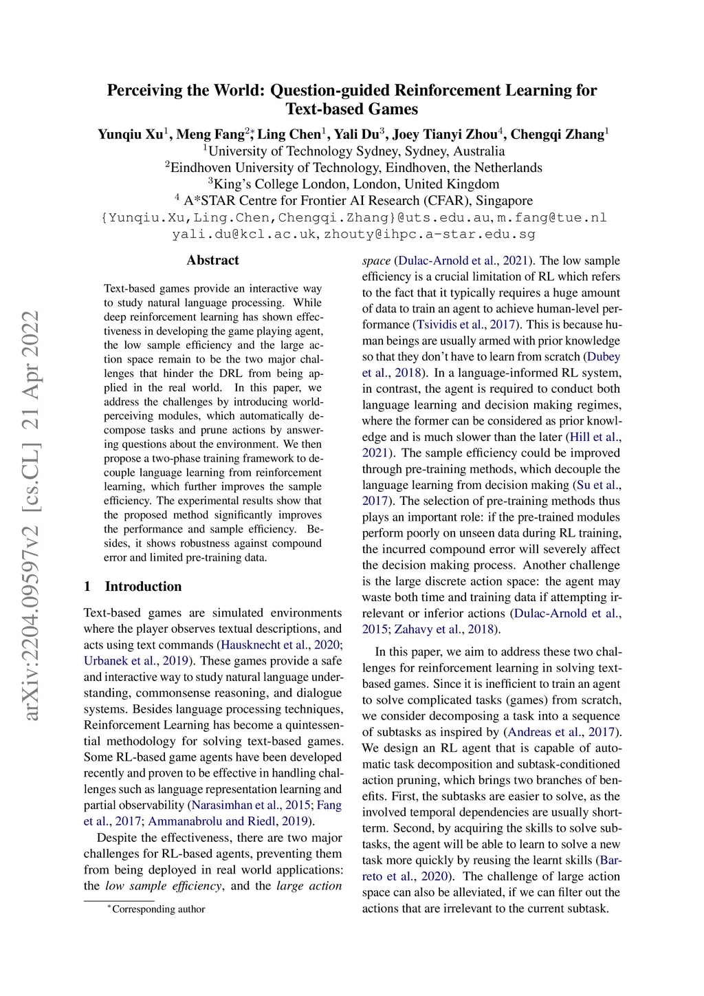 Text-based games provide an interactive way to study natural language processing. While deep reinforcement learning has shown effectiveness in developing the game playing agent, the low sample efficiency and the large action space remain to be the two major challenges that hinder the DRL from being applied in the real world. In this paper, we address the challenges by introducing world-perceiving modules, which automatically decompose tasks and prune actions by answering questions about the environment. We then propose a two-phase training framework to decouple language learning from reinforcement learning, which further improves the sample efficiency. The experimental results show that the proposed method significantly improves the performance and sample efficiency. Besides, it shows robustness against compound error and limited pre-training data.