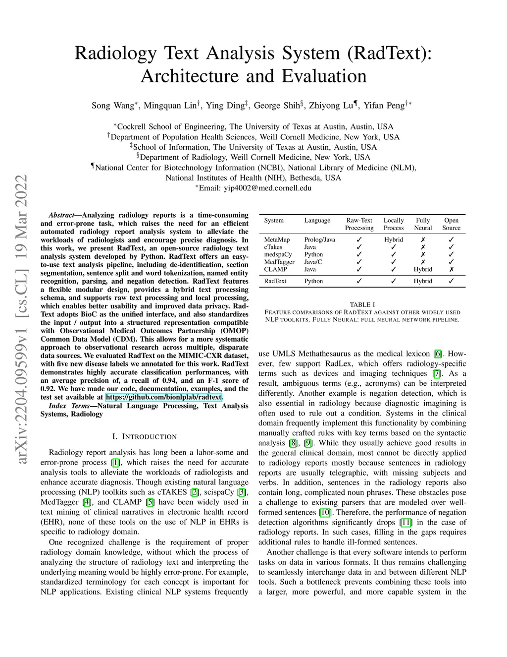 Radiology Text Analysis System (RadText): Architecture and Evaluation