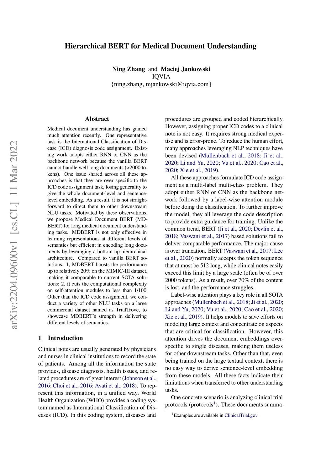 Medical document understanding has gained much attention recently. One representative task is the International Classification of Disease (ICD) diagnosis code assignment. Existing work adopts either RNN or CNN as the backbone network because the vanilla BERT cannot handle well long documents (>2000 to kens). One issue shared across all these approaches is that they are over specific to the ICD code assignment task, losing generality to give the whole document-level and sentence-level embedding. As a result, it is not straight-forward to direct them to other downstream NLU tasks. Motivated by these observations, we propose Medical Document BERT (MDBERT) for long medical document understanding tasks. MDBERT is not only effective in learning representations at different levels of semantics but efficient in encoding long documents by leveraging a bottom-up hierarchical architecture. Compared to vanilla BERT solutions: 1, MDBERT boosts the performance up to relatively 20% on the MIMIC-III dataset, making it comparable to current SOTA solutions; 2, it cuts the computational complexity on self-attention modules to less than 1/100. Other than the ICD code assignment, we conduct a variety of other NLU tasks on a large commercial dataset named as TrialTrove, to showcase MDBERT's strength in delivering different levels of semantics.