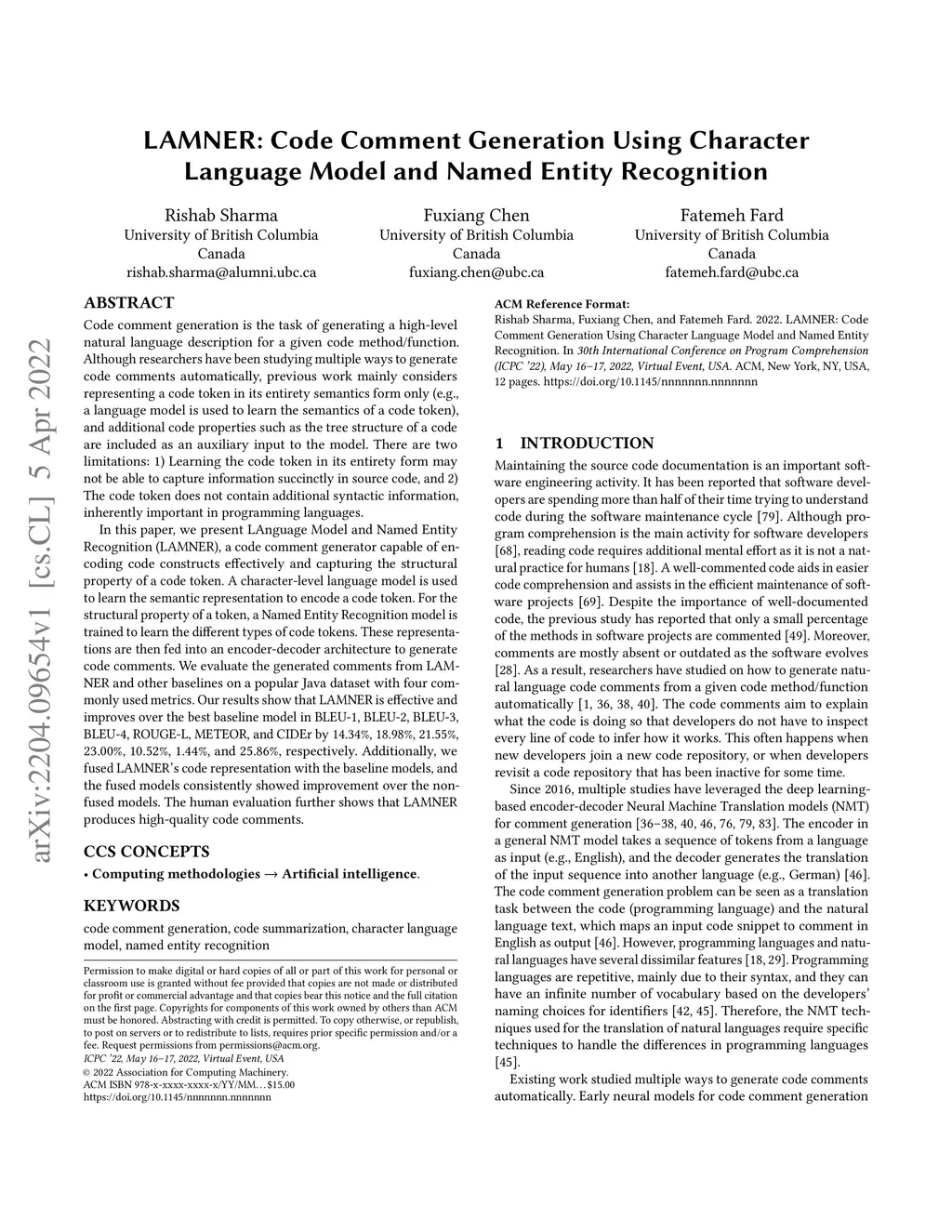 LAMNER: Code Comment Generation Using Character Language Model and Named