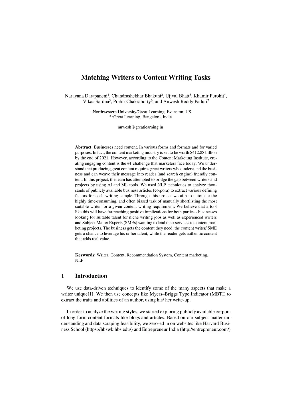 Businesses need content. In various forms and formats and for varied purposes. In fact, the content marketing industry is set to be worth $412.88 billion by the end of 2021. However, according to the Content Marketing Institute, creating engaging content is the #1 challenge that marketers face today. We under-stand that producing great content requires great writers who understand the business and can weave their message into reader (and search engine) friendly content. In this project, the team has attempted to bridge the gap between writers and projects by using AI and ML tools. We used NLP techniques to analyze thou-sands of publicly available business articles (corpora) to extract various defining factors for each writing sample. Through this project we aim to automate the highly time-consuming, and often biased task of manually shortlisting the most suitable writer for a given content writing requirement. We believe that a tool like this will have far reaching positive implications for both parties - businesses looking for suitable talent for niche writing jobs as well as experienced writers and Subject Matter Experts (SMEs) wanting to lend their services to content marketing projects. The business gets the content they need, the content writer/ SME gets a chance to leverage his or her talent, while the reader gets authentic content that adds real value.