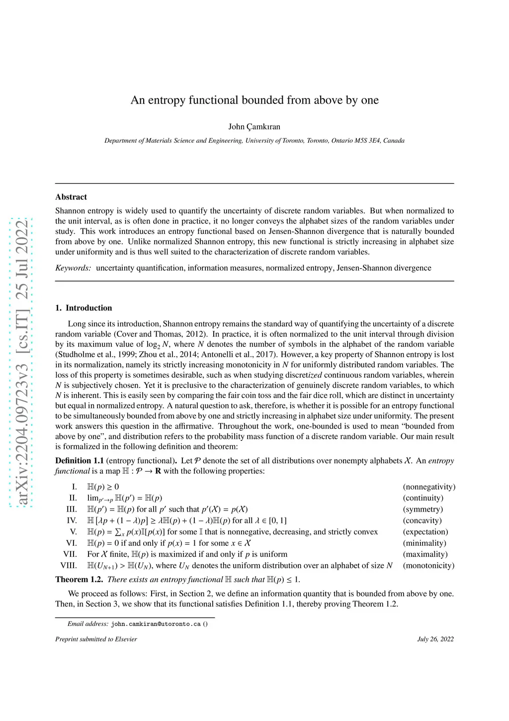 An entropy functional bounded from above by one