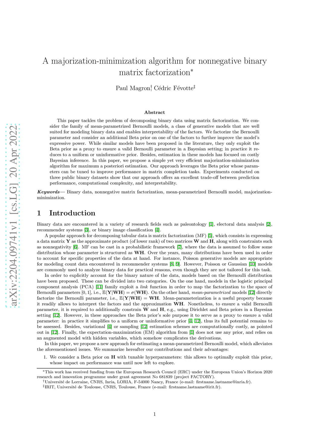 This paper tackles the problem of decomposing binary data using matrix factorization. We consider the family of mean-parametrized Bernoulli models, a class of generative models that are well suited for modeling binary data and enables interpretability of the factors. We factorize the Bernoulli parameter and consider an additional Beta prior on one of the factors to further improve the model's expressive power. While similar models have been proposed in the literature, they only exploit the Beta prior as a proxy to ensure a valid Bernoulli parameter in a Bayesian setting; in practice it reduces to a uniform or uninformative prior. Besides, estimation in these models has focused on costly Bayesian inference. In this paper, we propose a simple yet very efficient majorization-minimization algorithm for maximum a posteriori estimation. Our approach leverages the Beta prior whose parameters can be tuned to improve performance in matrix completion tasks. Experiments conducted on three public binary datasets show that our approach offers an excellent trade-off between prediction performance, computational complexity, and interpretability.