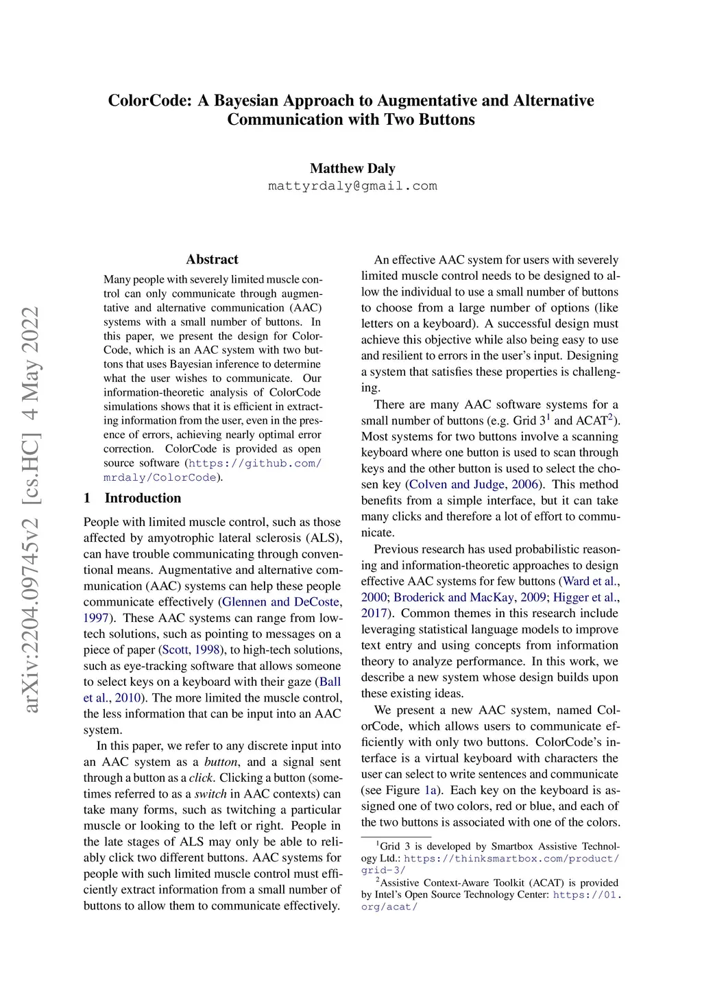 Many people with severely limited muscle control can only communicate through augmentative and alternative communication (AAC) systems with a small number of buttons. In this paper, we present the design for ColorCode, which is an AAC system with two buttons that uses Bayesian inference to determine what the user wishes to communicate. Our information-theoretic analysis of ColorCode simulations shows that it is efficient in extracting information from the user, even in the presence of errors, achieving nearly optimal error correction. ColorCode is provided as open source software (https://github.com/mrdaly/ColorCode).