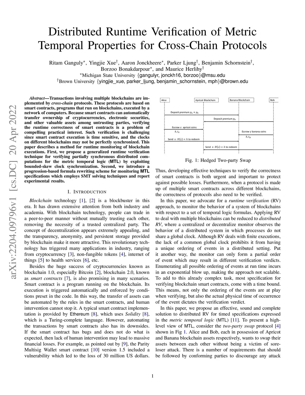 Transactions involving multiple blockchains are implemented by cross-chain protocols. These protocols are based on smart contracts, programs that run on blockchains, executed by a network of computers. Because smart contracts can automatically transfer ownership of cryptocurrencies, electronic securities, and other valuable assets among untrusting parties, verifying the runtime correctness of smart contracts is a problem of compelling practical interest. Such verification is challenging since smart contract execution is time-sensitive, and the clocks on different blockchains may not be perfectly synchronized. This paper describes a method for runtime monitoring of blockchain executions. First, we propose a generalized runtime verification technique for verifying partially synchronous distributed computations for the metric temporal logic (MTL) by exploiting bounded-skew clock synchronization. Second, we introduce a progression-based formula rewriting scheme for monitoring \MTL specifications which employ SMT solving techniques and report experimental results.