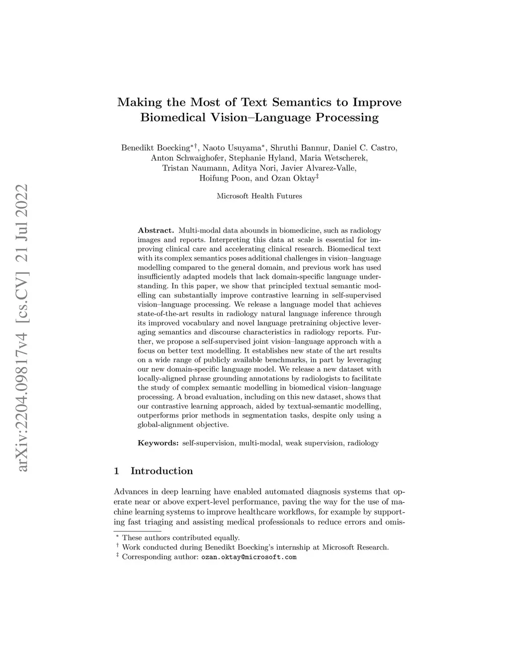 Multi-modal data abounds in biomedicine, such as radiology images and reports. Interpreting this data at scale is essential for improving clinical care and accelerating clinical research. Biomedical text with its complex semantics poses additional challenges in vision--language modelling compared to the general domain, and previous work has used insufficiently adapted models that lack domain-specific language understanding. In this paper, we show that principled textual semantic modelling can substantially improve contrastive learning in self-supervised vision--language processing. We release a language model that achieves state-of-the-art results in radiology natural language inference through its improved vocabulary and novel language pretraining objective leveraging semantics and discourse characteristics in radiology reports. Further, we propose a self-supervised joint vision--language approach with a focus on better text modelling. It establishes new state of the art results on a wide range of publicly available benchmarks, in part by leveraging our new domain-specific language model. We release a new dataset with locally-aligned phrase grounding annotations by radiologists to facilitate the study of complex semantic modelling in biomedical vision--language processing. A broad evaluation, including on this new dataset, shows that our contrastive learning approach, aided by textual-semantic modelling, outperforms prior methods in segmentation tasks, despite only using a global-alignment objective.