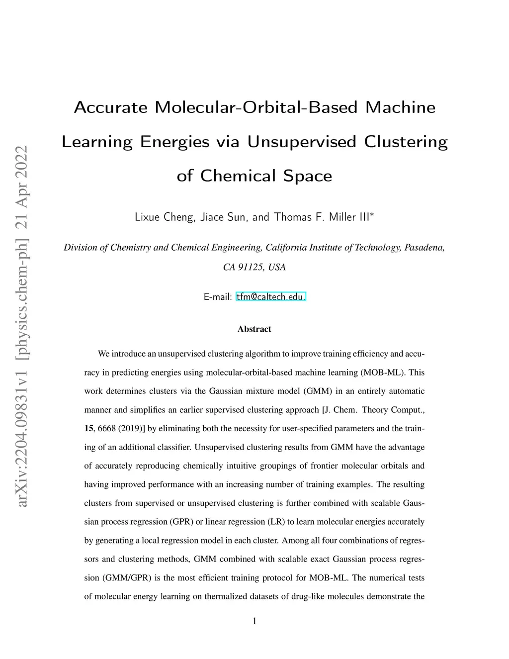 We introduce an unsupervised clustering algorithm to improve training efficiency and accuracy in predicting energies using molecular-orbital-based machine learning (MOB-ML). This work determines clusters via the Gaussian mixture model (GMM) in an entirely automatic manner and simplifies an earlier supervised clustering approach [J. Chem. Theory Comput., 15, 6668 (2019)] by eliminating both the necessity for user-specified parameters and the training of an additional classifier. Unsupervised clustering results from GMM have the advantage of accurately reproducing chemically intuitive groupings of frontier molecular orbitals and having improved performance with an increasing number of training examples. The resulting clusters from supervised or unsupervised clustering is further combined with scalable Gaussian process regression (GPR) or linear regression (LR) to learn molecular energies accurately by generating a local regression model in each cluster. Among all four combinations of regressors and clustering methods, GMM combined with scalable exact Gaussian process regression (GMM/GPR) is the most efficient training protocol for MOB-ML. The numerical tests of molecular energy learning on thermalized datasets of drug-like molecules demonstrate the improved accuracy, transferability, and learning efficiency of GMM/GPR over not only other training protocols for MOB-ML, i.e., supervised regression-clustering combined with GPR(RC/GPR) and GPR without clustering. GMM/GPR also provide the best molecular energy predictions compared with the ones from literature on the same benchmark datasets. With a lower scaling, GMM/GPR has a 10.4-fold speedup in wall-clock training time compared with scalable exact GPR with a training size of 6500 QM7b-T molecules.