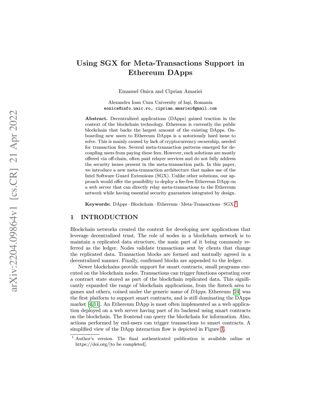 Using SGX for Meta-Transactions Support in Ethereum DApps