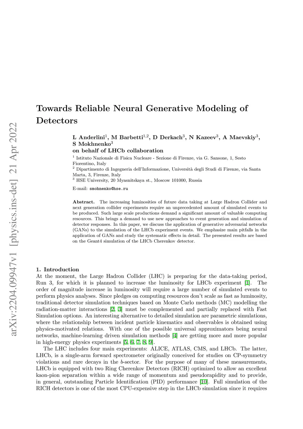 The increasing luminosities of future data taking at Large Hadron Collider and next generation collider experiments require an unprecedented amount of simulated events to be produced. Such large scale productions demand a significant amount of valuable computing resources. This brings a demand to use new approaches to event generation and simulation of detector responses. In this paper, we discuss the application of generative adversarial networks (GANs) to the simulation of the LHCb experiment events. We emphasize main pitfalls in the application of GANs and study the systematic effects in detail. The presented results are based on the Geant4 simulation of the LHCb Cherenkov detector.