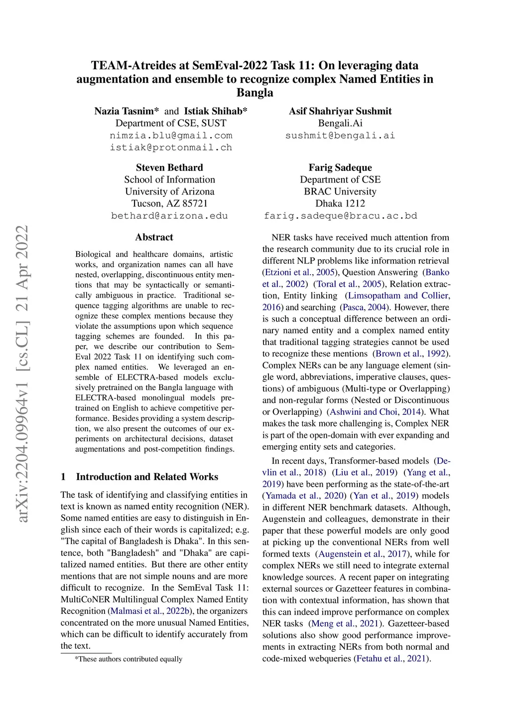 Many areas, such as the biological and healthcare domain, artistic works, and organization names, have nested, overlapping, discontinuous entity mentions that may even be syntactically or semantically ambiguous in practice. Traditional sequence tagging algorithms are unable to recognize these complex mentions because they may violate the assumptions upon which sequence tagging schemes are founded. In this paper, we describe our contribution to SemEval 2022 Task 11 on identifying such complex Named Entities. We have leveraged the ensemble of multiple ELECTRA-based models that were exclusively pretrained on the Bangla language with the performance of ELECTRA-based models pretrained on English to achieve competitive performance on the Track-11. Besides providing a system description, we will also present the outcomes of our experiments on architectural decisions, dataset augmentations, and post-competition findings.