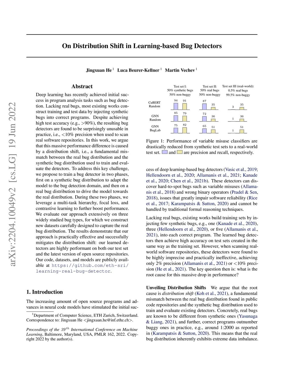 Deep learning has recently achieved initial success in program analysis tasks such as bug detection. Lacking real bugs, most existing works construct training and test data by injecting synthetic bugs into correct programs. Despite achieving high test accuracy (e.g., 90%), the resulting bug detectors are found to be surprisingly unusable in practice, i.e., <10% precision when used to scan real software repositories. In this work, we argue that this massive performance difference is caused by a distribution shift, i.e., a fundamental mismatch between the real bug distribution and the synthetic bug distribution used to train and evaluate the detectors. To address this key challenge, we propose to train a bug detector in two phases, first on a synthetic bug distribution to adapt the model to the bug detection domain, and then on a real bug distribution to drive the model towards the real distribution. During these two phases, we leverage a multi-task hierarchy, focal loss, and contrastive learning to further boost performance. We evaluate our approach extensively on three widely studied bug types, for which we construct new datasets carefully designed to capture the real bug distribution. The results demonstrate that our approach is practically effective and successfully mitigates the distribution shift: our learned detectors are highly performant on both our test set and the latest version of open source repositories. Our code, datasets, and models are publicly available at https://github.com/eth-sri/learning-real-bug-detector.