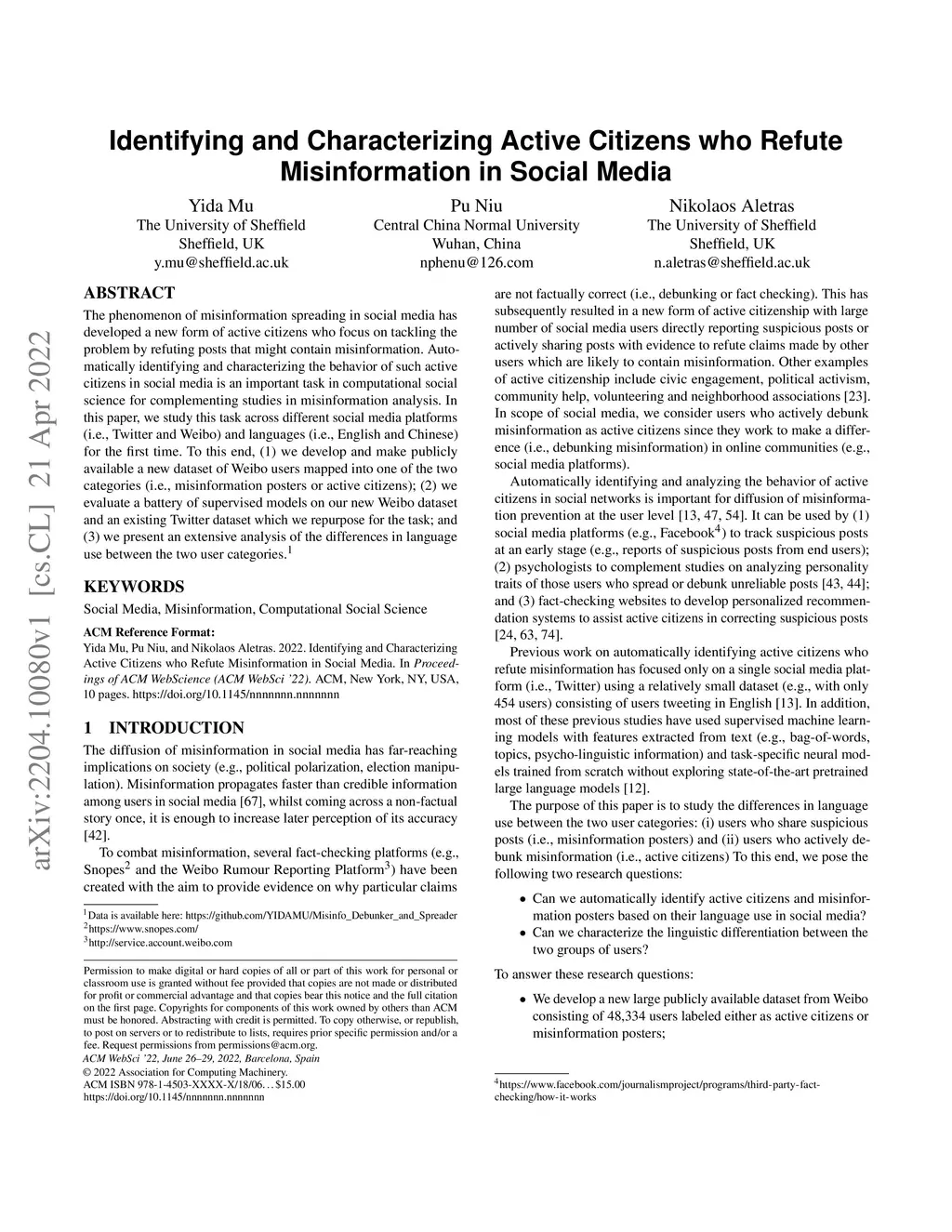 The phenomenon of misinformation spreading in social media has developed a new form of active citizens who focus on tackling the problem by refuting posts that might contain misinformation. Automatically identifying and characterizing the behavior of such active citizens in social media is an important task in computational social science for complementing studies in misinformation analysis. In this paper, we study this task across different social media platforms (i.e., Twitter and Weibo) and languages (i.e., English and Chinese) for the first time. To this end, (1) we develop and make publicly available a new dataset of Weibo users mapped into one of the two categories (i.e., misinformation posters or active citizens); (2) we evaluate a battery of supervised models on our new Weibo dataset and an existing Twitter dataset which we repurpose for the task; and (3) we present an extensive analysis of the differences in language use between the two user categories.