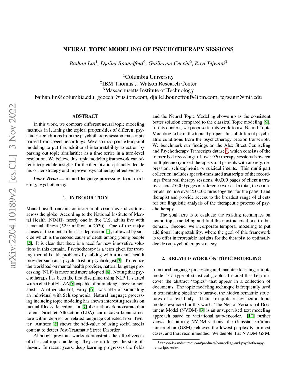 In this work, we compare different neural topic modeling methods in learning the topical propensities of different psychiatric conditions from the psychotherapy session transcripts parsed from speech recordings. We also incorporate temporal modeling to put this additional interpretability to action by parsing out topic similarities as a time series in a turn-level resolution. We believe this topic modeling framework can offer interpretable insights for the therapist to optimally decide his or her strategy and improve psychotherapy effectiveness.