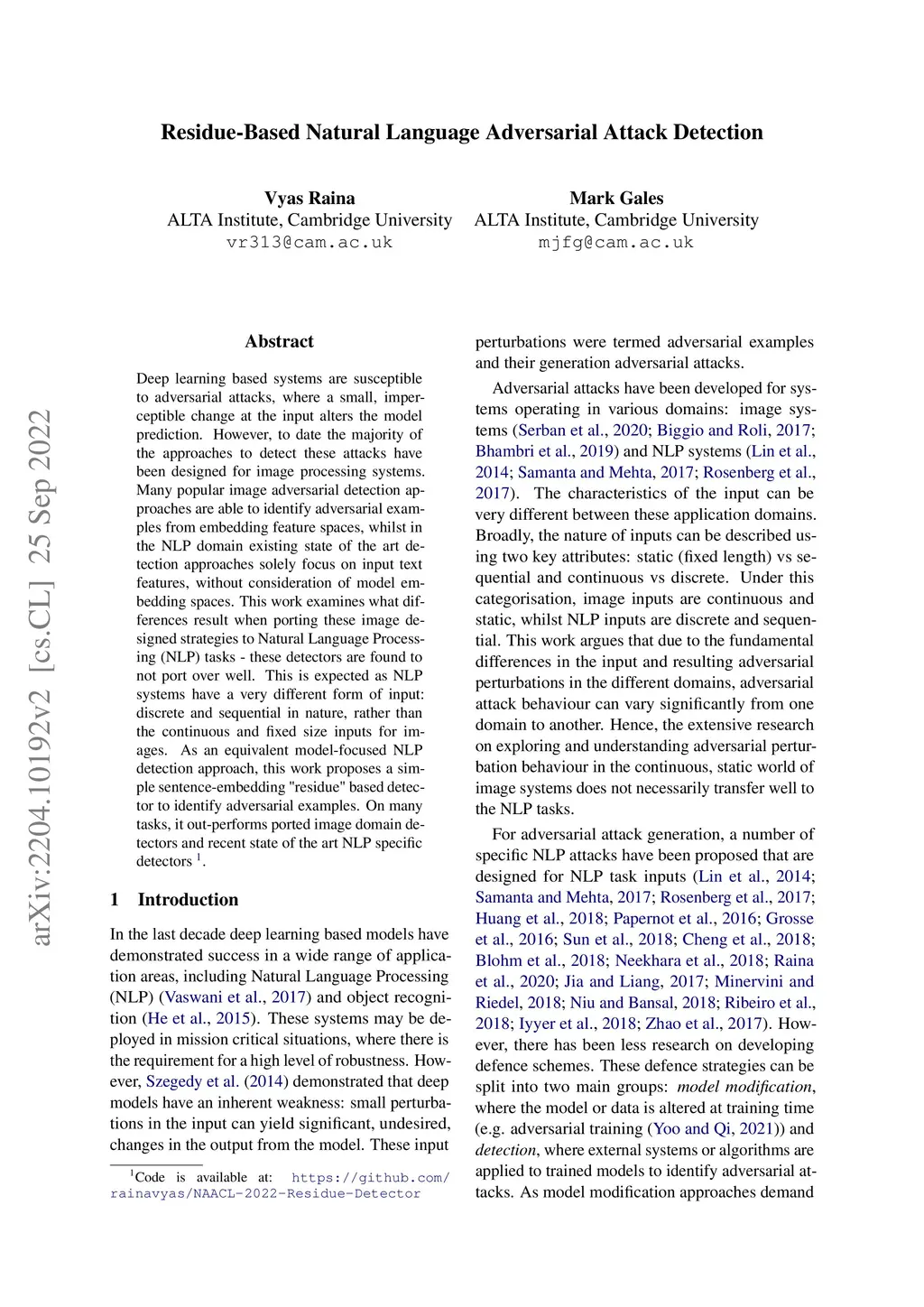 Deep learning based systems are susceptible to adversarial attacks, where a small, imperceptible change at the input alters the model prediction. However, to date the majority of the approaches to detect these attacks have been designed for image processing systems. Many popular image adversarial detection approaches are able to identify adversarial examples from embedding feature spaces, whilst in the NLP domain existing state of the art detection approaches solely focus on input text features, without consideration of model embedding spaces. This work examines what differences result when porting these image designed strategies to Natural Language Processing (NLP) tasks - these detectors are found to not port over well. This is expected as NLP systems have a very different form of input: discrete and sequential in nature, rather than the continuous and fixed size inputs for images. As an equivalent model-focused NLP detection approach, this work proposes a simple sentence-embedding "residue" based detector to identify adversarial examples. On many tasks, it out-performs ported image domain detectors and recent state of the art NLP specific detectors.