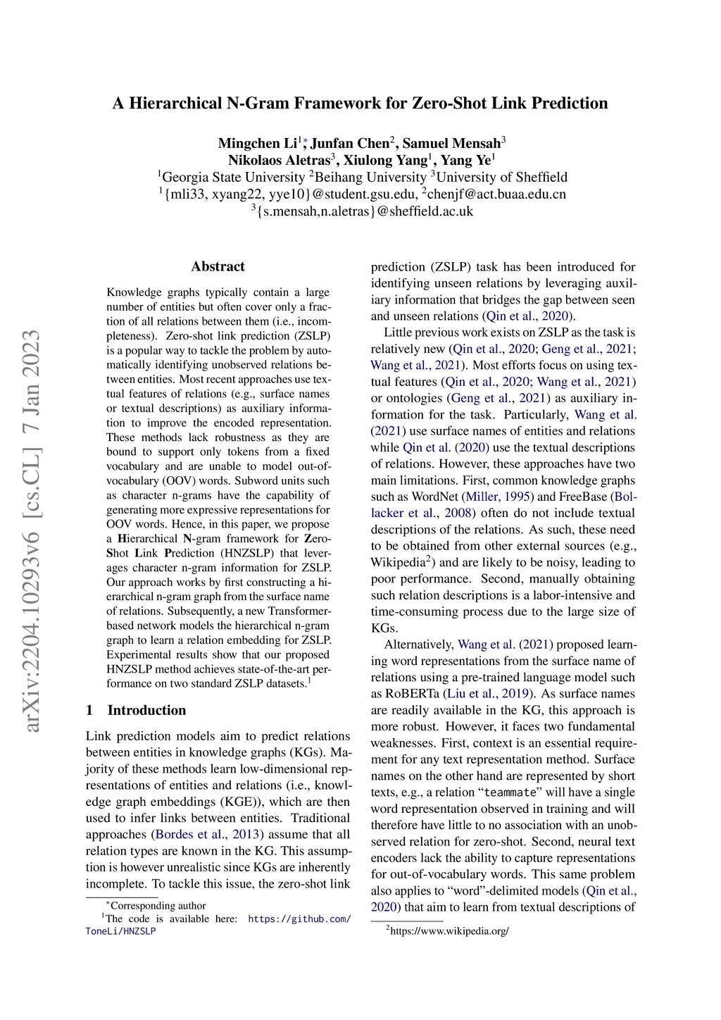 A Hierarchical N-Gram Framework for Zero-Shot Link Prediction