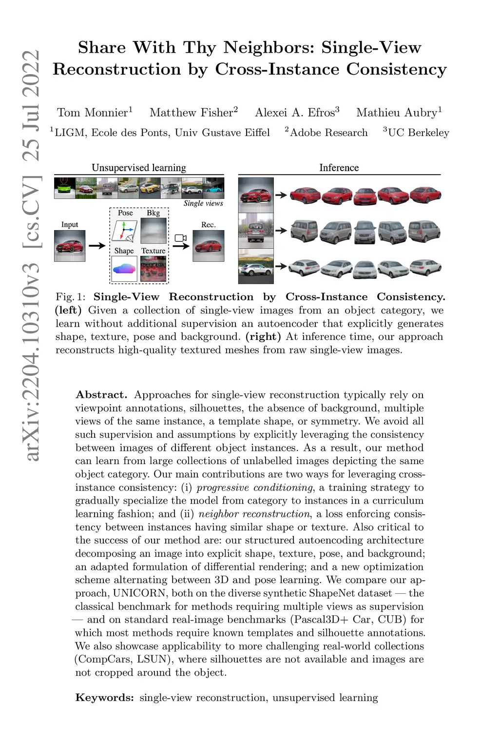 Approaches for single-view reconstruction typically rely on viewpoint annotations, silhouettes, the absence of background, multiple views of the same instance, a template shape, or symmetry. We avoid all such supervision and assumptions by explicitly leveraging the consistency between images of different object instances. As a result, our method can learn from large collections of unlabelled images depicting the same object category. Our main contributions are two ways for leveraging cross-instance consistency: (i) progressive conditioning, a training strategy to gradually specialize the model from category to instances in a curriculum learning fashion; and (ii) neighbor reconstruction, a loss enforcing consistency between instances having similar shape or texture. Also critical to the success of our method are: our structured autoencoding architecture decomposing an image into explicit shape, texture, pose, and background; an adapted formulation of differential rendering; and a new optimization scheme alternating between 3D and pose learning. We compare our approach, UNICORN, both on the diverse synthetic ShapeNet dataset - the classical benchmark for methods requiring multiple views as supervision - and on standard real-image benchmarks (Pascal3D+ Car, CUB) for which most methods require known templates and silhouette annotations. We also showcase applicability to more challenging real-world collections (CompCars, LSUN), where silhouettes are not available and images are not cropped around the object.
