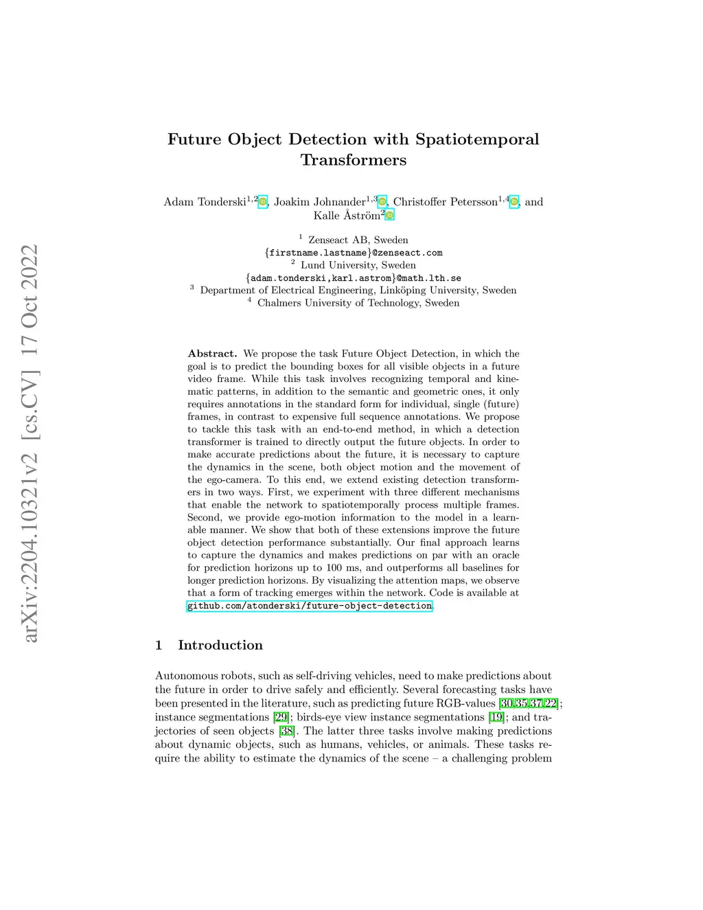 Future Object Detection with Spatiotemporal Transformers