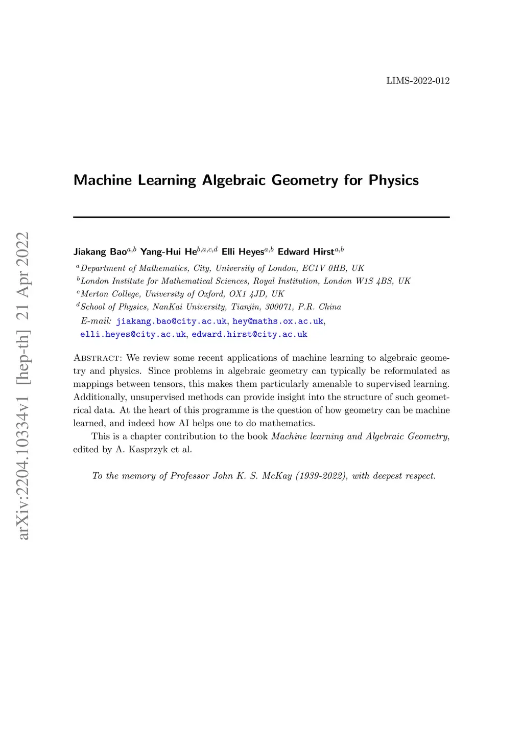We review some recent applications of machine learning to algebraic geometry and physics. Since problems in algebraic geometry can typically be reformulated as mappings between tensors, this makes them particularly amenable to supervised learning. Additionally, unsupervised methods can provide insight into the structure of such geometrical data. At the heart of this programme is the question of how geometry can be machine learned, and indeed how AI helps one to do mathematics. This is a chapter contribution to the book Machine learning and Algebraic Geometry, edited by A. Kasprzyk et al.