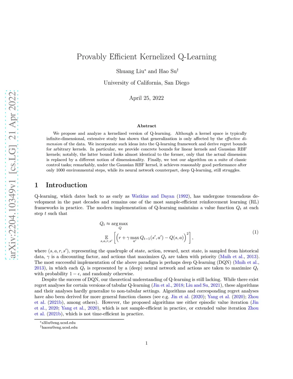 We propose and analyze a kernelized version of Q-learning. Although a kernel space is typically infinite-dimensional, extensive study has shown that generalization is only affected by the effective dimension of the data. We incorporate such ideas into the Q-learning framework and derive regret bounds for arbitrary kernels. In particular, we provide concrete bounds for linear kernels and Gaussian RBF kernels; notably, the latter bound looks almost identical to the former, only that the actual dimension is replaced by a different notion of dimensionality. Finally, we test our algorithm on a suite of classic control tasks; remarkably, under the Gaussian RBF kernel, it achieves reasonably good performance after only 1000 environmental steps, while its neural network counterpart, deep Q-learning, still struggles.