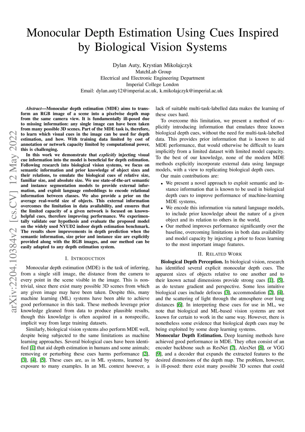 Monocular Depth Estimation Using Cues Inspired by Biological Vision