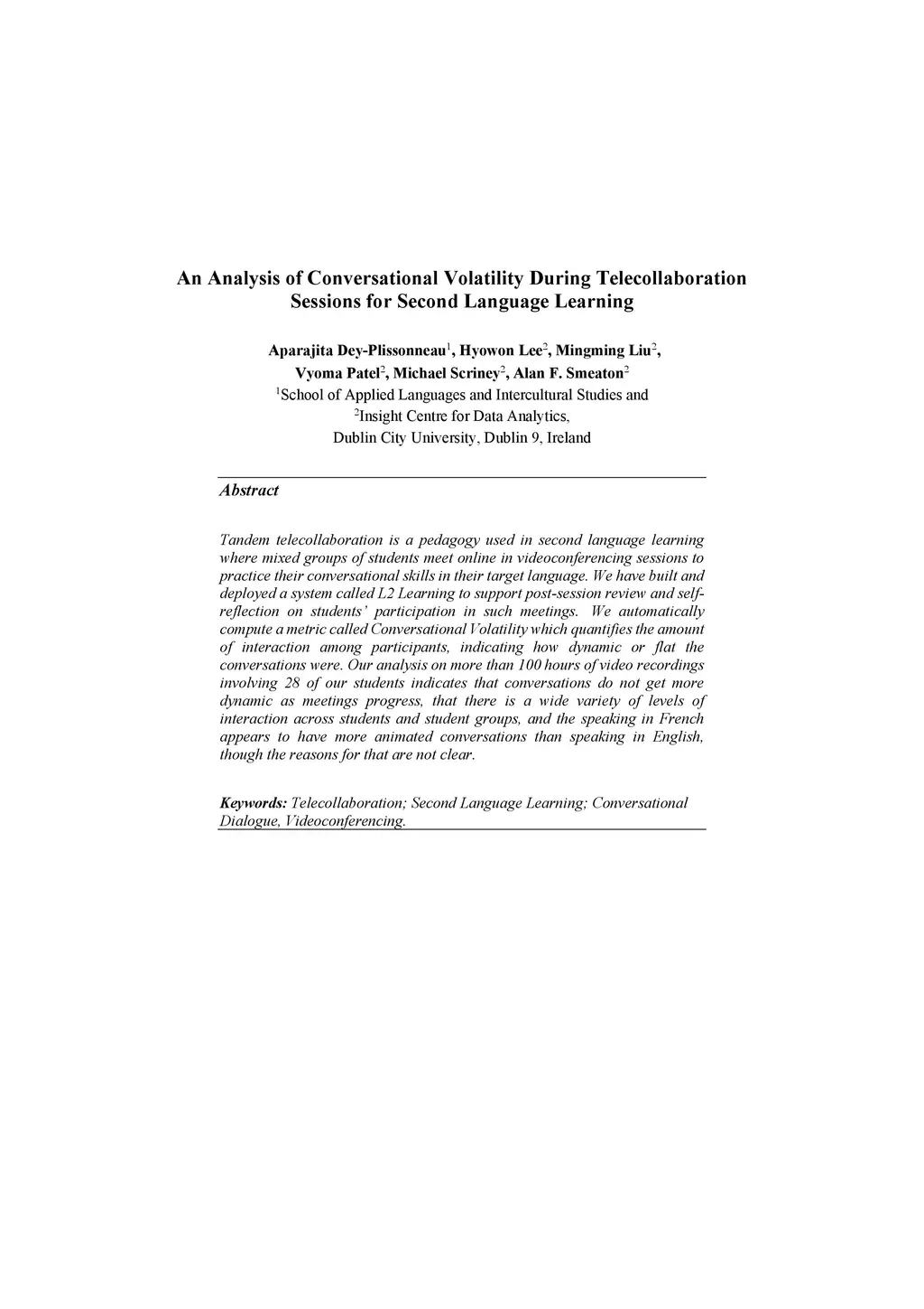Tandem telecollaboration is a pedagogy used in second language learning where mixed groups of students meet online in videoconferencing sessions to practice their conversational skills in their target language. We have built and deployed a system called L2 Learning to support post-session review and self-reflection on students participation in such meetings. We automatically compute a metric called Conversational Volatility which quantifies the amount of interaction among participants, indicating how dynamic or flat the conversations were. Our analysis on more than 100 hours of video recordings involving 28 of our students indicates that conversations do not get more dynamic as meetings progress, that there is a wide variety of levels of interaction across students and student groups, and the speaking in French appears to have more animated conversations than speaking in English, though the reasons for that are not clear.