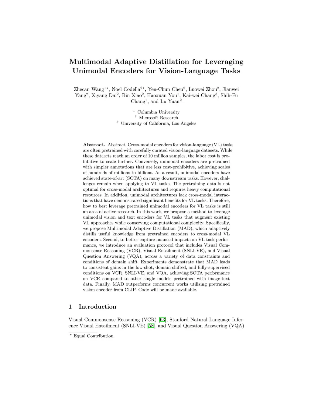 Cross-modal encoders for vision-language (VL) tasks are often pretrained with carefully curated vision-language datasets. While these datasets reach an order of 10 million samples, the labor cost is prohibitive to scale further. Conversely, unimodal encoders are pretrained with simpler annotations that are less cost-prohibitive, achieving scales of hundreds of millions to billions. As a result, unimodal encoders have achieved state-of-art (SOTA) on many downstream tasks. However, challenges remain when applying to VL tasks. The pretraining data is not optimal for cross-modal architectures and requires heavy computational resources. In addition, unimodal architectures lack cross-modal interactions that have demonstrated significant benefits for VL tasks. Therefore, how to best leverage pretrained unimodal encoders for VL tasks is still an area of active research. In this work, we propose a method to leverage unimodal vision and text encoders for VL tasks that augment existing VL approaches while conserving computational complexity. Specifically, we propose Multimodal Adaptive Distillation (MAD), which adaptively distills useful knowledge from pretrained encoders to cross-modal VL encoders. Second, to better capture nuanced impacts on VL task performance, we introduce an evaluation protocol that includes Visual Commonsense Reasoning (VCR), Visual Entailment (SNLI-VE), and Visual Question Answering (VQA), across a variety of data constraints and conditions of domain shift. Experiments demonstrate that MAD leads to consistent gains in the low-shot, domain-shifted, and fully-supervised conditions on VCR, SNLI-VE, and VQA, achieving SOTA performance on VCR compared to other single models pretrained with image-text data. Finally, MAD outperforms concurrent works utilizing pretrained vision encoder from CLIP. Code will be made available.