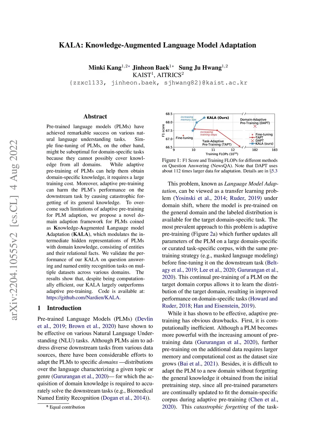 Pre-trained language models (PLMs) have achieved remarkable success on various natural language understanding tasks. Simple fine-tuning of PLMs, on the other hand, might be suboptimal for domain-specific tasks because they cannot possibly cover knowledge from all domains. While adaptive pre-training of PLMs can help them obtain domain-specific knowledge, it requires a large training cost. Moreover, adaptive pre-training can harm the PLM's performance on the downstream task by causing catastrophic forgetting of its general knowledge. To overcome such limitations of adaptive pre-training for PLM adaption, we propose a novel domain adaption framework for PLMs coined as Knowledge-Augmented Language model Adaptation (KALA), which modulates the intermediate hidden representations of PLMs with domain knowledge, consisting of entities and their relational facts. We validate the performance of our KALA on question answering and named entity recognition tasks on multiple datasets across various domains. The results show that, despite being computationally efficient, our KALA largely outperforms adaptive pre-training. Code is available at: https://github.com/Nardien/KALA/.