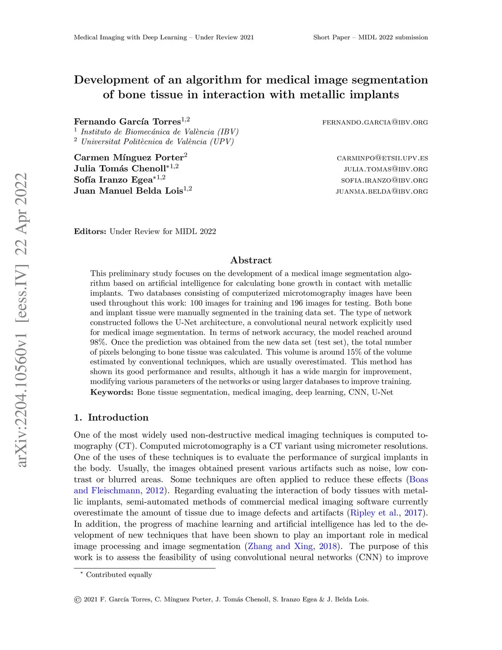 This preliminary study focuses on the development of a medical image segmentation algorithm based on artificial intelligence for calculating bone growth in contact with metallic implants. %as a result of the problem of estimating the growth of new bone tissue due to artifacts. %the presence of various types of distortions and errors, known as artifacts. Two databases consisting of computerized microtomography images have been used throughout this work: 100 images for training and 196 images for testing. Both bone and implant tissue were manually segmented in the training data set. The type of network constructed follows the U-Net architecture, a convolutional neural network explicitly used for medical image segmentation. In terms of network accuracy, the model reached around 98\%. Once the prediction was obtained from the new data set (test set), the total number of pixels belonging to bone tissue was calculated. This volume is around 15\% of the volume estimated by conventional techniques, which are usually overestimated. This method has shown its good performance and results, although it has a wide margin for improvement, modifying various parameters of the networks or using larger databases to improve training.