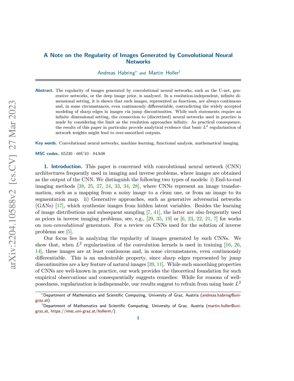 The regularity of images generated by convolutional neural networks, such as the U-net, generative adversarial networks, or the deep image prior, is analyzed. In a resolution-independent, infinite dimensional setting, it is shown that such images, represented as functions, are always continuous and, in some circumstances, even continuously differentiable, contradicting the widely accepted modeling of sharp edges in images via jump discontinuities. While such statements require an infinite dimensional setting, the connection to (discretized) neural networks used in practice is made by considering the limit as the resolution approaches infinity. As practical consequence, the results of this paper suggest to refrain from basic L2 regularization of network weights in case of images being the network output.
