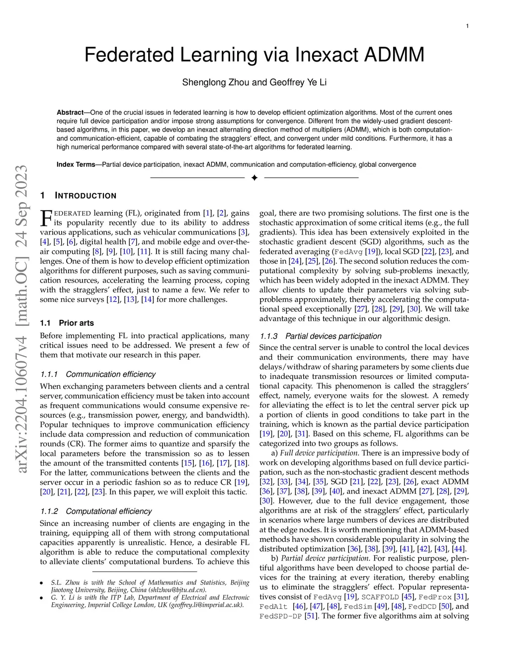 One of the crucial issues in federated learning is how to develop efficient optimization algorithms. Most of the current ones require full device participation and/or impose strong assumptions for convergence. Different from the widely-used gradient descent-based algorithms, in this paper, we develop an inexact alternating direction method of multipliers (ADMM), which is both computation- and communication-efficient, capable of combating the stragglers' effect, and convergent under mild conditions. Furthermore, it has a high numerical performance compared with several state-of-the-art algorithms for federated learning.