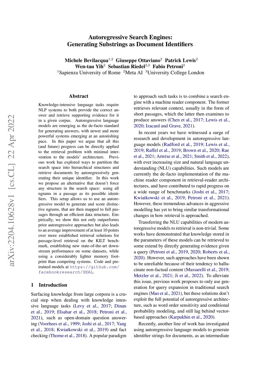 Knowledge-intensive language tasks require NLP systems to both provide the correct answer and retrieve supporting evidence for it in a given corpus. Autoregressive language models are emerging as the de-facto standard for generating answers, with newer and more powerful systems emerging at an astonishing pace. In this paper we argue that all this (and future) progress can be directly applied to the retrieval problem with minimal intervention to the models' architecture. Previous work has explored ways to partition the search space into hierarchical structures and retrieve documents by autoregressively generating their unique identifier. In this work we propose an alternative that doesn't force any structure in the search space: using all ngrams in a passage as its possible identifiers. This setup allows us to use an autoregressive model to generate and score distinctive ngrams, that are then mapped to full passages through an efficient data structure. Empirically, we show this not only outperforms prior autoregressive approaches but also leads to an average improvement of at least 10 points over more established retrieval solutions for passage-level retrieval on the KILT benchmark, establishing new state-of-the-art downstream performance on some datasets, while using a considerably lighter memory footprint than competing systems. Code and pre-trained models at https://github.com/facebookresearch/SEAL.