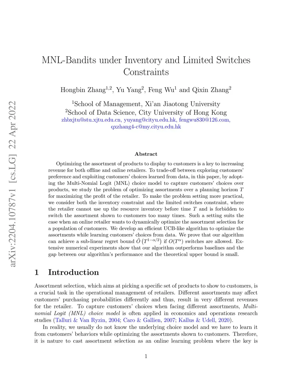 Optimizing the assortment of products to display to customers is a key to increasing revenue for both offline and online retailers. To trade-off between exploring customers' preference and exploiting customers' choices learned from data, in this paper, by adopting the Multi-Nomial Logit (MNL) choice model to capture customers' choices over products, we study the problem of optimizing assortments over a planning horizon for maximizing the profit of the retailer. To make the problem setting more practical, we consider both the inventory constraint and the limited switches constraint, where the retailer cannot use up the resource inventory before time and is forbidden to switch the assortment shown to customers too many times. Such a setting suits the case when an online retailer wants to dynamically optimize the assortment selection for a population of customers. We develop an efficient UCB-like algorithm to optimize the assortments while learning customers' choices from data. We prove that our algorithm can achieve a sub-linear regret bound if switches are allowed. %, and our regret bound is optimal with respect to . Extensive numerical experiments show that our algorithm outperforms baselines and the gap between our algorithm's performance and the theoretical upper bound is small.