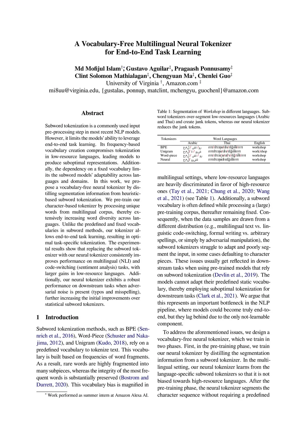 A Vocabulary-Free Multilingual Neural Tokenizer for End-to-End Task