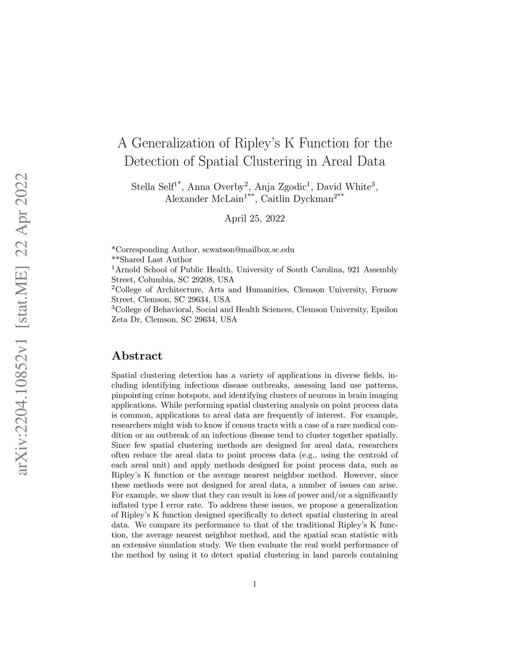 Spatial clustering detection has a variety of applications in diverse fields, including identifying infectious disease outbreaks, assessing land use patterns, pinpointing crime hotspots, and identifying clusters of neurons in brain imaging applications. While performing spatial clustering analysis on point process data is common, applications to areal data are frequently of interest. For example, researchers might wish to know if census tracts with a case of a rare medical condition or an outbreak of an infectious disease tend to cluster together spatially. Since few spatial clustering methods are designed for areal data, researchers often reduce the areal data to point process data (e.g., using the centroid of each areal unit) and apply methods designed for point process data, such as Ripley's K function or the average nearest neighbor method. However, since these methods were not designed for areal data, a number of issues can arise. For example, we show that they can result in loss of power and/or a significantly inflated type I error rate. To address these issues, we propose a generalization of Ripley's K function designed specifically to detect spatial clustering in areal data. We compare its performance to that of the traditional Ripley's K function, the average nearest neighbor method, and the spatial scan statistic with an extensive simulation study. We then evaluate the real world performance of the method by using it to detect spatial clustering in land parcels containing conservation easements and US counties with high pediatric overweight/obesity rates.