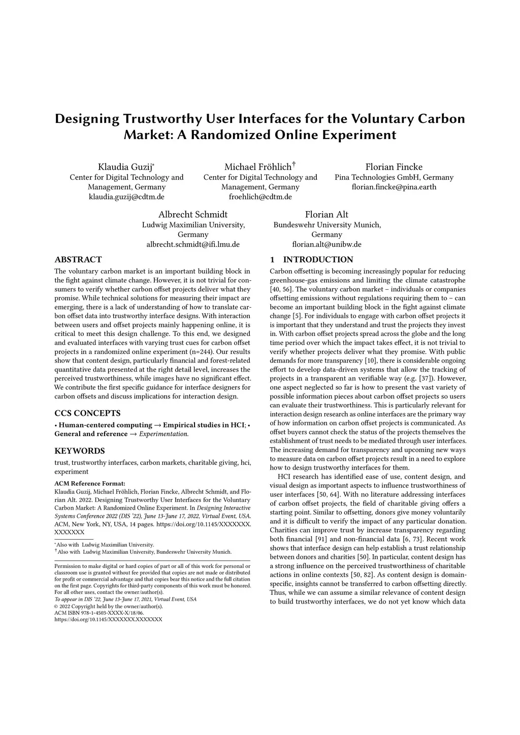 The voluntary carbon market is an important building block in the fight against climate change. However, it is not trivial for consumers to verify whether carbon offset projects deliver what they promise. While technical solutions for measuring their impact are emerging, there is a lack of understanding of how to translate this data into interface designs that mediate the establishment of trust. With interaction between users and offset projects mainly happening online, it is critical to meet this design challenge. To this end, we designed and evaluated interfaces with varying trust cues for carbon offset projects in a randomized online experiment (n=244). Our results show that content design, particularly financial and forest-related quantitative data presented at the right detail level, increases the perceived trustworthiness, while images have no significant effect. We contribute the first specific guidance for interface designers for carbon offsets and discuss implications for interaction design.