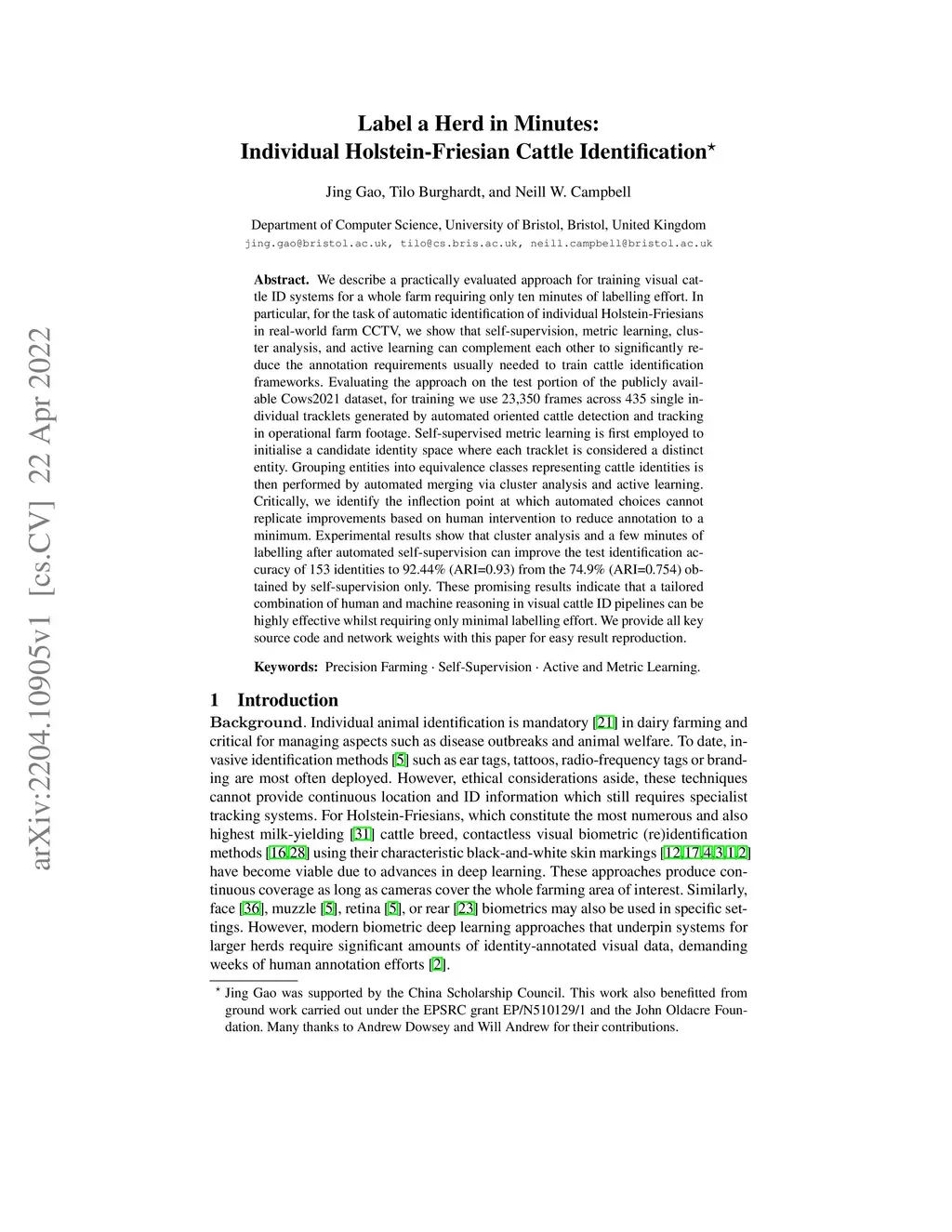 We describe a practically evaluated approach for training visual cattle ID systems for a whole farm requiring only ten minutes of labelling effort. In particular, for the task of automatic identification of individual Holstein-Friesians in real-world farm CCTV, we show that self-supervision, metric learning, cluster analysis, and active learning can complement each other to significantly reduce the annotation requirements usually needed to train cattle identification frameworks. Evaluating the approach on the test portion of the publicly available Cows2021 dataset, for training we use 23,350 frames across 435 single individual tracklets generated by automated oriented cattle detection and tracking in operational farm footage. Self-supervised metric learning is first employed to initialise a candidate identity space where each tracklet is considered a distinct entity. Grouping entities into equivalence classes representing cattle identities is then performed by automated merging via cluster analysis and active learning. Critically, we identify the inflection point at which automated choices cannot replicate improvements based on human intervention to reduce annotation to a minimum. Experimental results show that cluster analysis and a few minutes of labelling after automated self-supervision can improve the test identification accuracy of 153 identities to 92.44% (ARI=0.93) from the 74.9% (ARI=0.754) obtained by self-supervision only. These promising results indicate that a tailored combination of human and machine reasoning in visual cattle ID pipelines can be highly effective whilst requiring only minimal labelling effort. We provide all key source code and network weights with this paper for easy result reproduction.