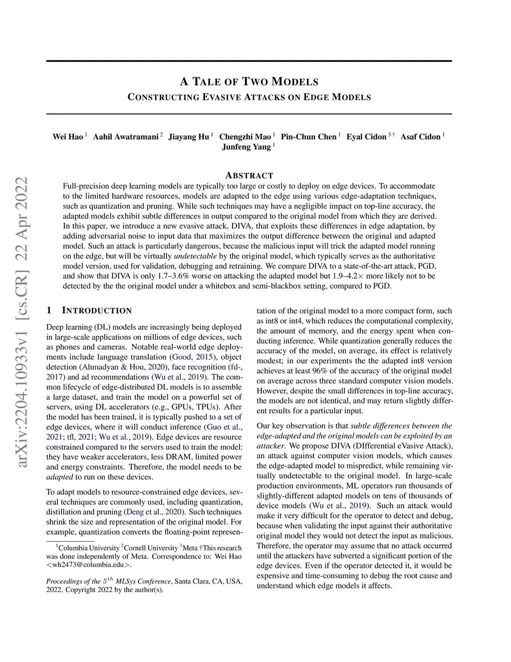 Full-precision deep learning models are typically too large or costly to deploy on edge devices. To accommodate to the limited hardware resources, models are adapted to the edge using various edge-adaptation techniques, such as quantization and pruning. While such techniques may have a negligible impact on top-line accuracy, the adapted models exhibit subtle differences in output compared to the original model from which they are derived. In this paper, we introduce a new evasive attack, DIVA, that exploits these differences in edge adaptation, by adding adversarial noise to input data that maximizes the output difference between the original and adapted model. Such an attack is particularly dangerous, because the malicious input will trick the adapted model running on the edge, but will be virtually undetectable by the original model, which typically serves as the authoritative model version, used for validation, debugging and retraining. We compare DIVA to a state-of-the-art attack, PGD, and show that DIVA is only 1.7-3.6% worse on attacking the adapted model but 1.9-4.2 times more likely not to be detected by the the original model under a whitebox and semi-blackbox setting, compared to PGD.
