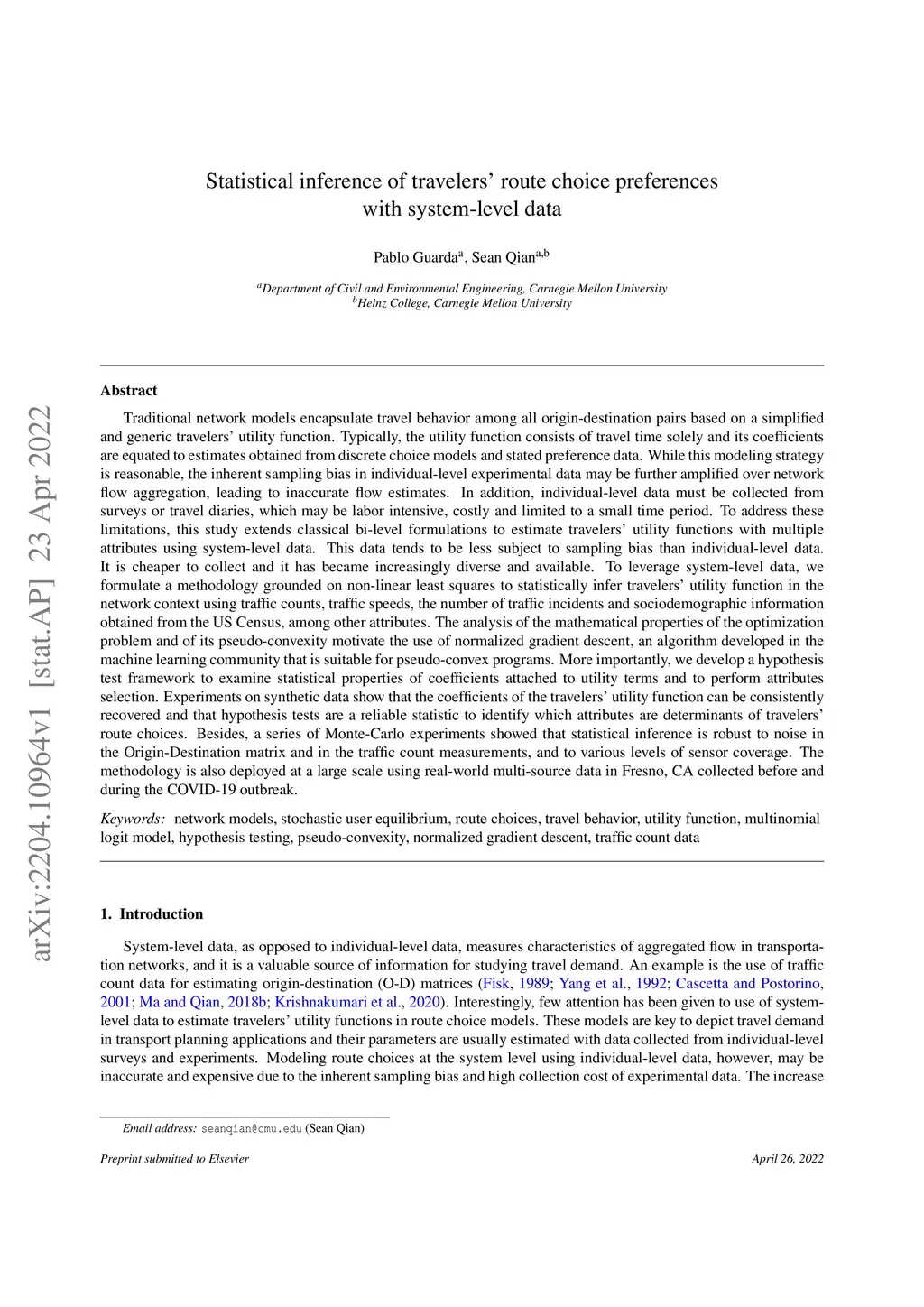 Traditional network models encapsulate travel behavior among all origin-destination pairs based on a simplified and generic utility function. Typically, the utility function consists of travel time solely and its coefficients are equated to estimates obtained from stated preference data. While this modeling strategy is reasonable, the inherent sampling bias in individual-level data may be further amplified over network flow aggregation, leading to inaccurate flow estimates. This data must be collected from surveys or travel diaries, which may be labor intensive, costly and limited to a small time period. To address these limitations, this study extends classical bi-level formulations to estimate travelers' utility functions with multiple attributes using system-level data. We formulate a methodology grounded on non-linear least squares to statistically infer travelers' utility function in the network context using traffic counts, traffic speeds, traffic incidents and sociodemographic information, among other attributes. The analysis of the mathematical properties of the optimization problem and of its pseudo-convexity motivate the use of normalized gradient descent. We also develop a hypothesis test framework to examine statistical properties of the utility function coefficients and to perform attributes selection. Experiments on synthetic data show that the coefficients are consistently recovered and that hypothesis tests are a reliable statistic to identify which attributes are determinants of travelers' route choices. Besides, a series of Monte-Carlo experiments suggest that statistical inference is robust to noise in the Origin-Destination matrix and in the traffic counts, and to various levels of sensor coverage. The methodology is also deployed at a large scale using real-world multi-source data in Fresno, CA collected before and during the COVID-19 outbreak.