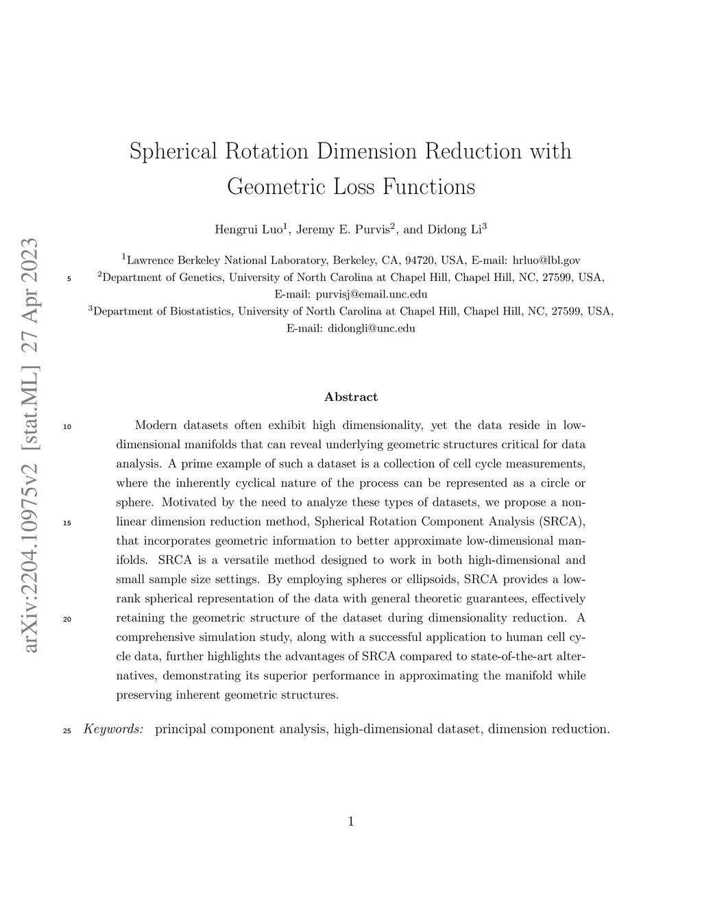 Modern datasets often exhibit high dimensionality, yet the data reside in low-dimensional manifolds that can reveal underlying geometric structures critical for data analysis. A prime example of such a dataset is a collection of cell cycle measurements, where the inherently cyclical nature of the process can be represented as a circle or sphere. Motivated by the need to analyze these types of datasets, we propose a nonlinear dimension reduction method, Spherical Rotation Component Analysis (SRCA), that incorporates geometric information to better approximate low-dimensional manifolds. SRCA is a versatile method designed to work in both high-dimensional and small sample size settings. By employing spheres or ellipsoids, SRCA provides a low-rank spherical representation of the data with general theoretic guarantees, effectively retaining the geometric structure of the dataset during dimensionality reduction. A comprehensive simulation study, along with a successful application to human cell cycle data, further highlights the advantages of SRCA compared to state-of-the-art alternatives, demonstrating its superior performance in approximating the manifold while preserving inherent geometric structures.