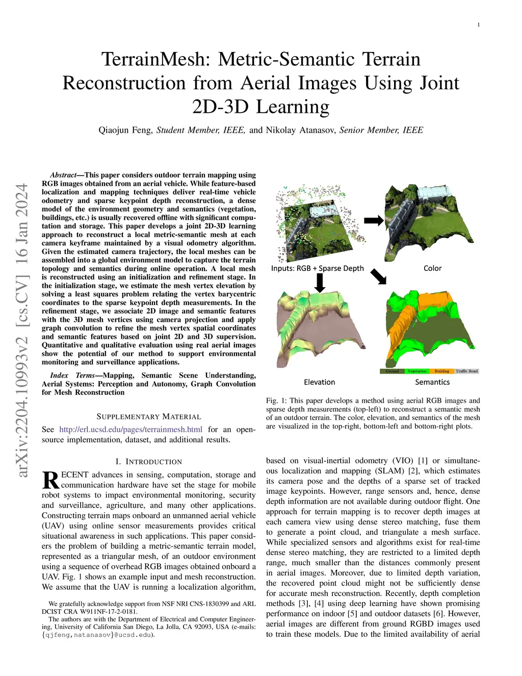 This paper considers outdoor terrain mapping using RGB images obtained from an aerial vehicle. While feature-based localization and mapping techniques deliver real-time vehicle odometry and sparse keypoint depth reconstruction, a dense model of the environment geometry and semantics (vegetation, buildings, etc.) is usually recovered offline with significant computation and storage. This paper develops a joint 2D-3D learning approach to reconstruct a local metric-semantic mesh at each camera keyframe maintained by a visual odometry algorithm. Given the estimated camera trajectory, the local meshes can be assembled into a global environment model to capture the terrain topology and semantics during online operation. A local mesh is reconstructed using an initialization and refinement stage. In the initialization stage, we estimate the mesh vertex elevation by solving a least squares problem relating the vertex barycentric coordinates to the sparse keypoint depth measurements. In the refinement stage, we associate 2D image and semantic features with the 3D mesh vertices using camera projection and apply graph convolution to refine the mesh vertex spatial coordinates and semantic features based on joint 2D and 3D supervision. Quantitative and qualitative evaluation using real aerial images show the potential of our method to support environmental monitoring and surveillance applications.