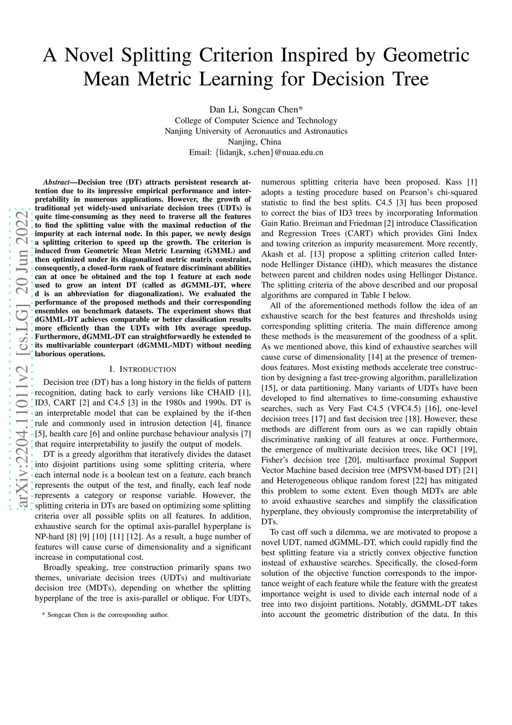 Decision tree (DT) attracts persistent research attention due to its impressive empirical performance and interpretability in numerous applications. However, the growth of traditional yet widely-used univariate decision trees (UDTs) is quite time-consuming as they need to traverse all the features to find the splitting value with the maximal reduction of the impurity at each internal node. In this paper, we newly design a splitting criterion to speed up the growth. The criterion is induced from Geometric Mean Metric Learning (GMML) and then optimized under its diagonalized metric matrix constraint, consequently, a closed-form rank of feature discriminant abilities can at once be obtained and the top 1 feature at each node used to grow an intent DT (called as dGMML-DT, where d is an abbreviation for diagonalization). We evaluated the performance of the proposed methods and their corresponding ensembles on benchmark datasets. The experiment shows that dGMML-DT achieves comparable or better classification results more efficiently than the UDTs with 10x average speedup. Furthermore, dGMML-DT can straightforwardly be extended to its multivariable counterpart (dGMML-MDT) without needing laborious operations.