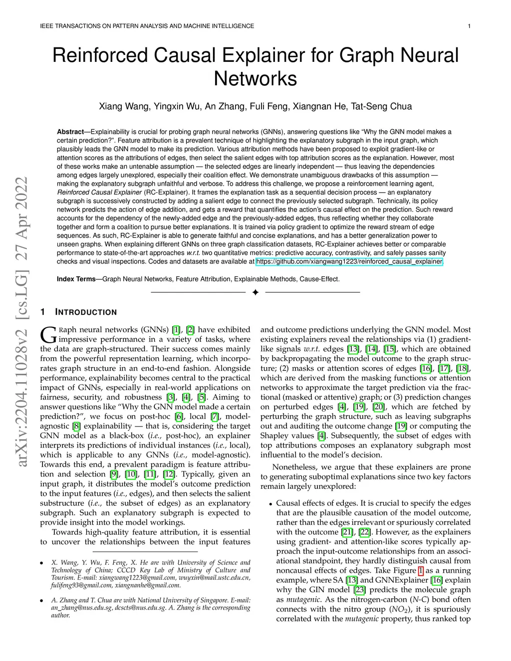 Explainability is crucial for probing graph neural networks (GNNs), answering questions like "Why the GNN model makes a certain prediction?". Feature attribution is a prevalent technique of highlighting the explanatory subgraph in the input graph, which plausibly leads the GNN model to make its prediction. Various attribution methods exploit gradient-like or attention scores as the attributions of edges, then select the salient edges with top attribution scores as the explanation. However, most of these works make an untenable assumption - the selected edges are linearly independent - thus leaving the dependencies among edges largely unexplored, especially their coalition effect. We demonstrate unambiguous drawbacks of this assumption - making the explanatory subgraph unfaithful and verbose. To address this challenge, we propose a reinforcement learning agent, Reinforced Causal Explainer (RC-Explainer). It frames the explanation task as a sequential decision process - an explanatory subgraph is successively constructed by adding a salient edge to connect the previously selected subgraph. Technically, its policy network predicts the action of edge addition, and gets a reward that quantifies the action's causal effect on the prediction. Such reward accounts for the dependency of the newly-added edge and the previously-added edges, thus reflecting whether they collaborate together and form a coalition to pursue better explanations. As such, RC-Explainer is able to generate faithful and concise explanations, and has a better generalization power to unseen graphs. When explaining different GNNs on three graph classification datasets, RC-Explainer achieves better or comparable performance to SOTA approaches w.r.t. predictive accuracy and contrastivity, and safely passes sanity checks and visual inspections. Codes are available at https://github.com/xiangwang1223/reinforced_causal_explainer.