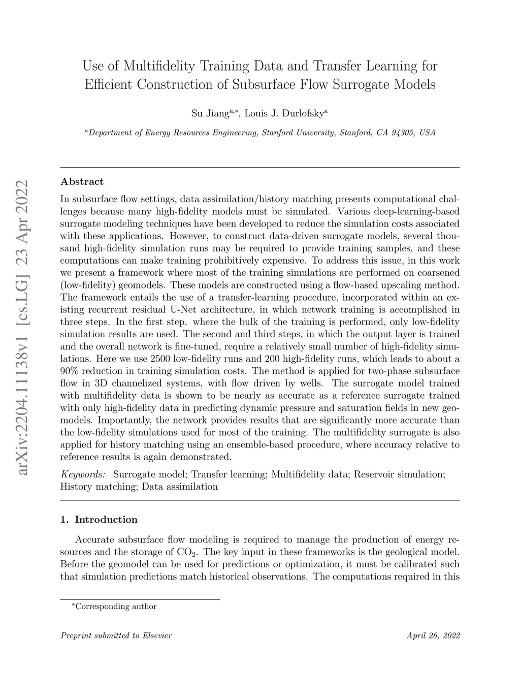 Data assimilation presents computational challenges because many high-fidelity models must be simulated. Various deep-learning-based surrogate modeling techniques have been developed to reduce the simulation costs associated with these applications. However, to construct data-driven surrogate models, several thousand high-fidelity simulation runs may be required to provide training samples, and these computations can make training prohibitively expensive. To address this issue, in this work we present a framework where most of the training simulations are performed on coarsened geomodels. These models are constructed using a flow-based upscaling method. The framework entails the use of a transfer-learning procedure, incorporated within an existing recurrent residual U-Net architecture, in which network training is accomplished in three steps. In the first step. where the bulk of the training is performed, only low-fidelity simulation results are used. The second and third steps, in which the output layer is trained and the overall network is fine-tuned, require a relatively small number of high-fidelity simulations. Here we use 2500 low-fidelity runs and 200 high-fidelity runs, which leads to about a 90% reduction in training simulation costs. The method is applied for two-phase subsurface flow in 3D channelized systems, with flow driven by wells. The surrogate model trained with multifidelity data is shown to be nearly as accurate as a reference surrogate trained with only high-fidelity data in predicting dynamic pressure and saturation fields in new geomodels. Importantly, the network provides results that are significantly more accurate than the low-fidelity simulations used for most of the training. The multifidelity surrogate is also applied for history matching using an ensemble-based procedure, where accuracy relative to reference results is again demonstrated.