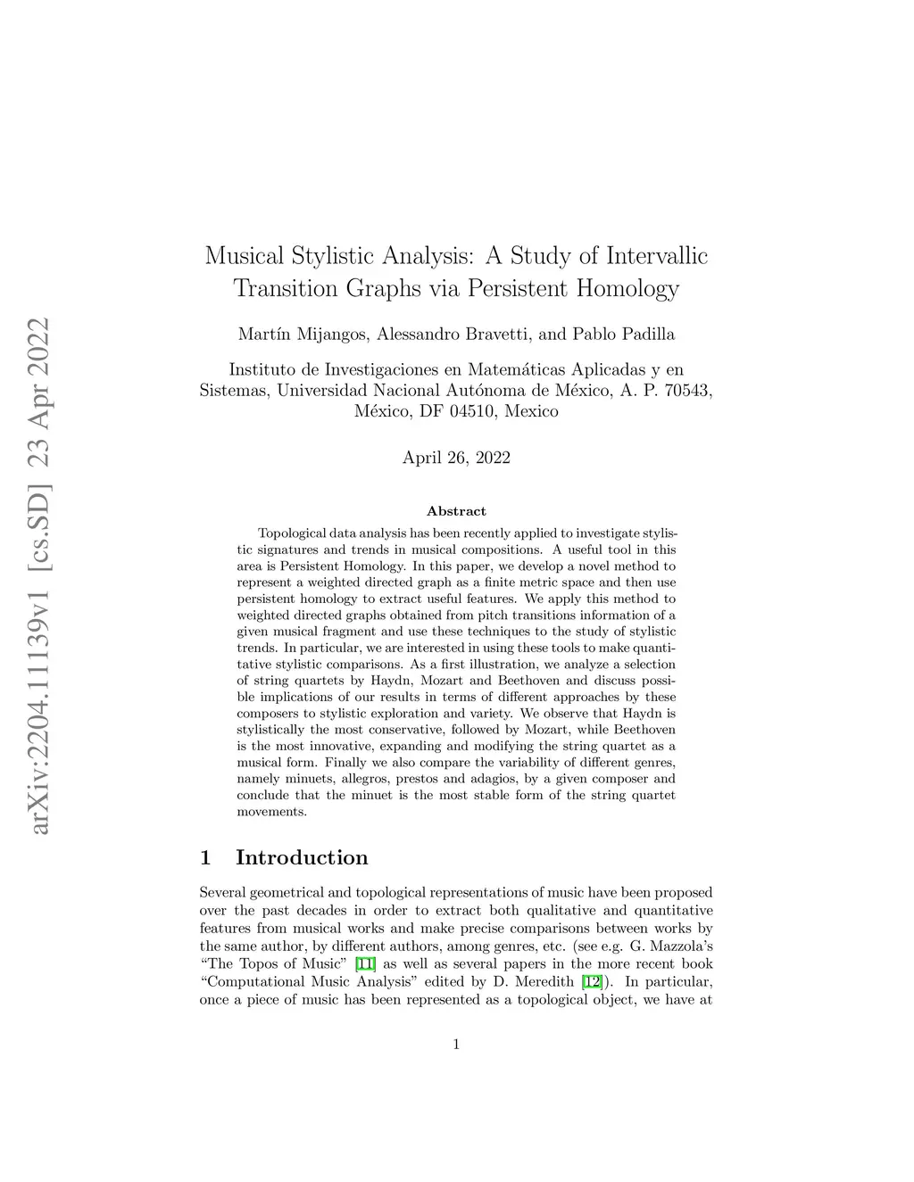 Topological data analysis has been recently applied to investigate stylistic signatures and trends in musical compositions. A useful tool in this area is Persistent Homology. In this paper, we develop a novel method to represent a weighted directed graph as a finite metric space and then use persistent homology to extract useful features. We apply this method to weighted directed graphs obtained from pitch transitions information of a given musical fragment and use these techniques to the study of stylistic trends. In particular, we are interested in using these tools to make quantitative stylistic comparisons. As a first illustration, we analyze a selection of string quartets by Haydn, Mozart and Beethoven and discuss possible implications of our results in terms of different approaches by these composers to stylistic exploration and variety. We observe that Haydn is stylistically the most conservative, followed by Mozart, while Beethoven is the most innovative, expanding and modifying the string quartet as a musical form. Finally we also compare the variability of different genres, namely minuets, allegros, prestos and adagios, by a given composer and conclude that the minuet is the most stable form of the string quartet movements.