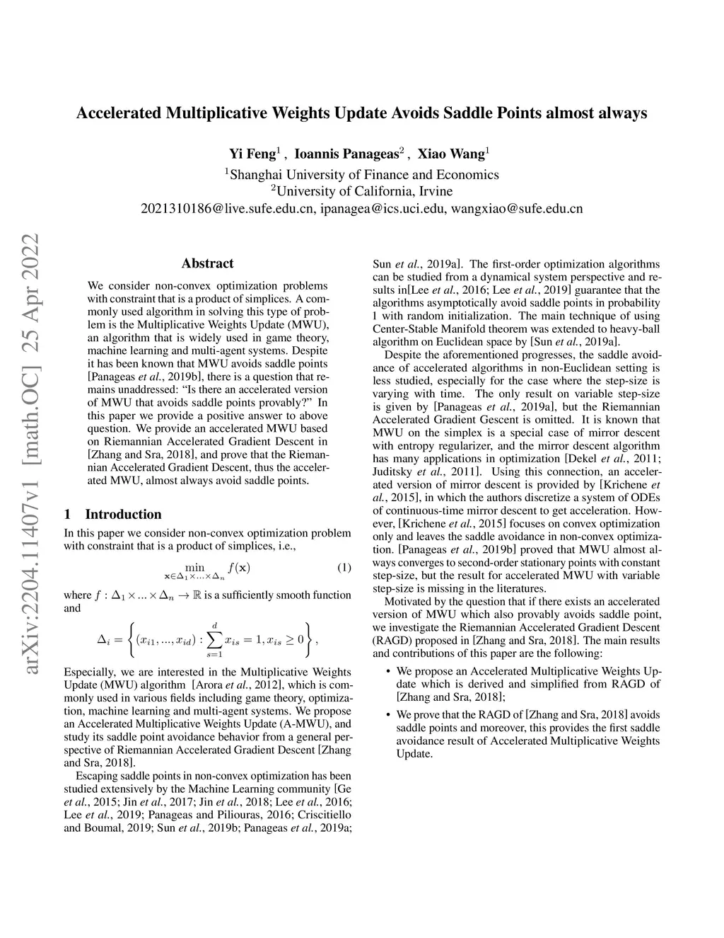We consider non-convex optimization problems with constraint that is a product of simplices. A commonly used algorithm in solving this type of problem is the Multiplicative Weights Update (MWU), an algorithm that is widely used in game theory, machine learning and multi-agent systems. Despite it has been known that MWU avoids saddle points, there is a question that remains unaddressed:"Is there an accelerated version of MWU that avoids saddle points provably?" In this paper we provide a positive answer to above question. We provide an accelerated MWU based on Riemannian Accelerated Gradient Descent, and prove that the Riemannian Accelerated Gradient Descent, thus the accelerated MWU, almost always avoid saddle points.