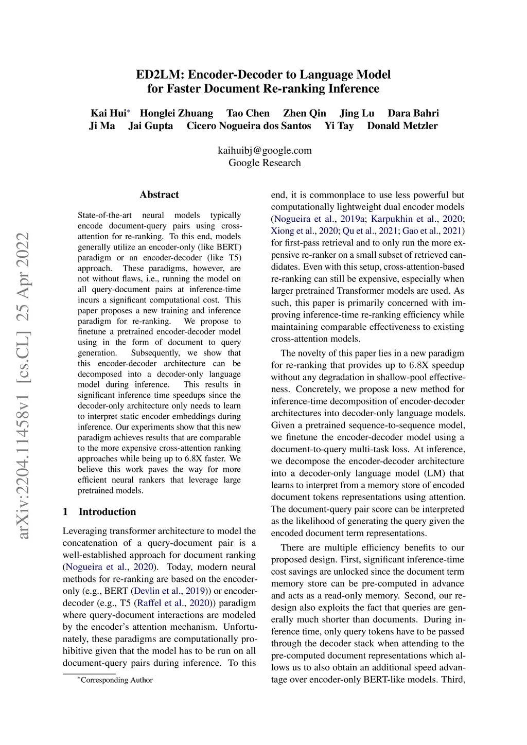 State-of-the-art neural models typically encode document-query pairs using cross-attention for re-ranking. To this end, models generally utilize an encoder-only (like BERT) paradigm or an encoder-decoder (like T5) approach. These paradigms, however, are not without flaws, i.e., running the model on all query-document pairs at inference-time incurs a significant computational cost. This paper proposes a new training and inference paradigm for re-ranking. We propose to finetune a pretrained encoder-decoder model using in the form of document to query generation. Subsequently, we show that this encoder-decoder architecture can be decomposed into a decoder-only language model during inference. This results in significant inference time speedups since the decoder-only architecture only needs to learn to interpret static encoder embeddings during inference. Our experiments show that this new paradigm achieves results that are comparable to the more expensive cross-attention ranking approaches while being up to 6.8X faster. We believe this work paves the way for more efficient neural rankers that leverage large pretrained models.