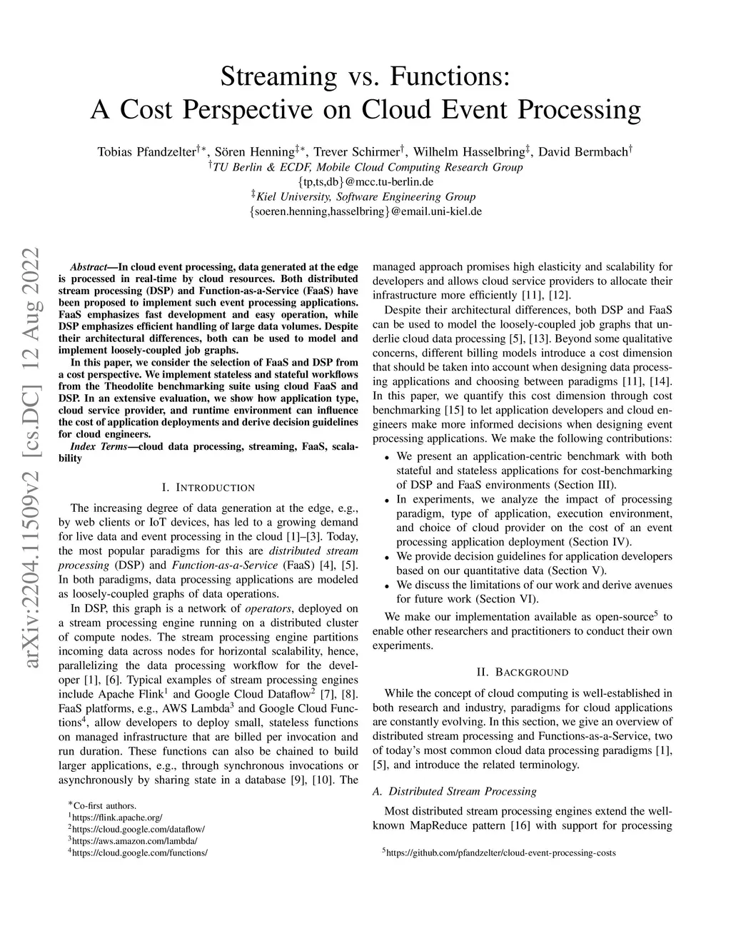In cloud event processing, data generated at the edge is processed in real-time by cloud resources. Both distributed stream processing (DSP) and Function-as-a-Service (FaaS) have been proposed to implement such event processing applications. FaaS emphasizes fast development and easy operation, while DSP emphasizes efficient handling of large data volumes. Despite their architectural differences, both can be used to model and implement loosely-coupled job graphs. In this paper, we consider the selection of FaaS and DSP from a cost perspective. We implement stateless and stateful workflows from the Theodolite benchmarking suite using cloud FaaS and DSP. In an extensive evaluation, we show how application type, cloud service provider, and runtime environment can influence the cost of application deployments and derive decision guidelines for cloud engineers.