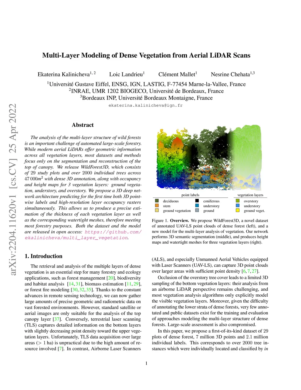 The analysis of the multi-layer structure of wild forests is an important challenge of automated large-scale forestry. While modern aerial LiDARs offer geometric information across all vegetation layers, most datasets and methods focus only on the segmentation and reconstruction of the top of canopy. We release WildForest3D, which consists of 29 study plots and over 2000 individual trees across 47 000m2 with dense 3D annotation, along with occupancy and height maps for 3 vegetation layers: ground vegetation, understory, and overstory. We propose a 3D deep network architecture predicting for the first time both 3D point-wise labels and high-resolution layer occupancy rasters simultaneously. This allows us to produce a precise estimation of the thickness of each vegetation layer as well as the corresponding watertight meshes, therefore meeting most forestry purposes. Both the dataset and the model are released in open access: https://github.com/ekalinicheva/multi_layer_vegetation.