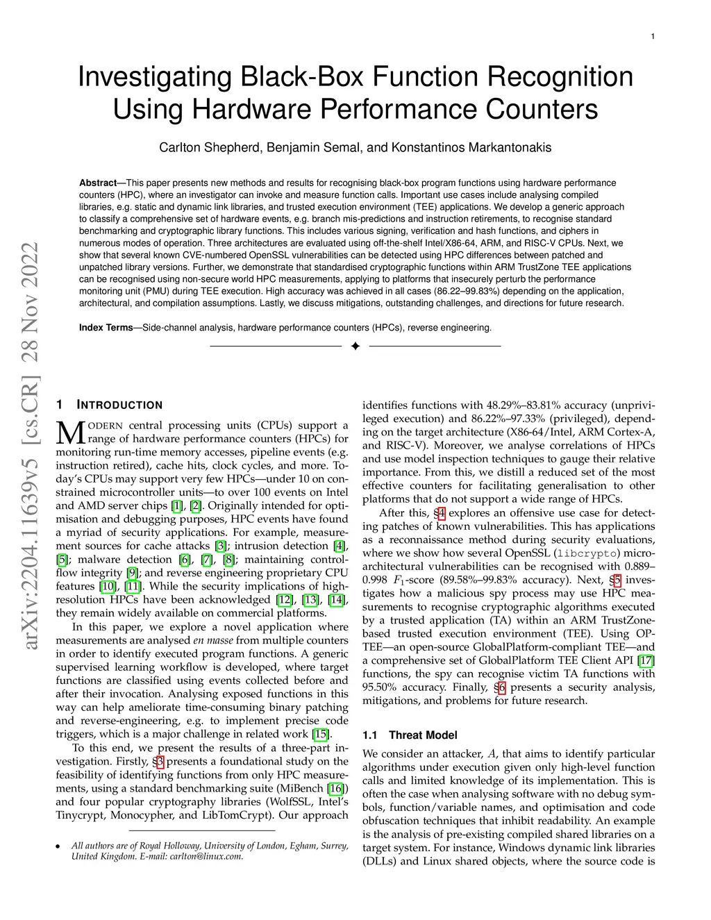 Investigating Black-Box Function Recognition Using Hardware Performance