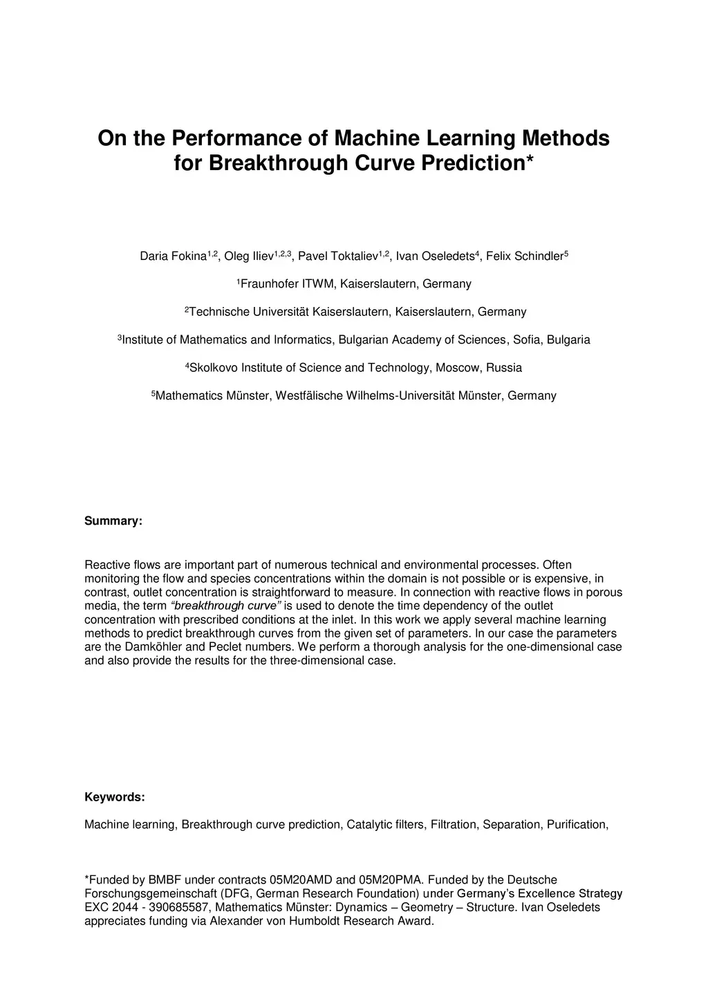 On the Performance of Machine Learning Methods for Breakthrough Curve